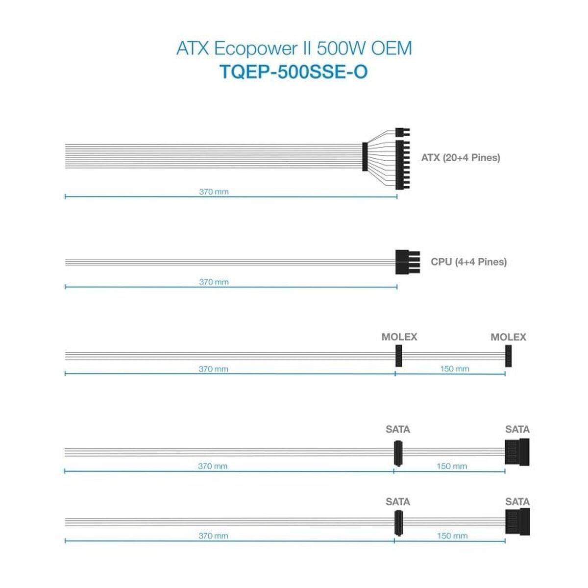 TooQ Fonte Ecopower II. Puissance totale: 500 W, Fréquence d'entrée AC: 50 - 60 Hz, délai de déclenchement du signal Power Good: 100 - 500 ms. Connecteur de la carte mère: 20+4 pin ATX, Longueur de câble d'alimentation de carte-mère: 35 cm, Longueur du câble d'alimentation SATA: 500 mm. Utilité: PC, Facteur de forme de l'unité d'alimentation: ATX, Niveau sonore: 15 dB. Couleur du produit: Argent, Diamètre du ventilateur: 12 cm, Nombre de ventilateurs: 1 ventilateur(s). Largeur: 86 mm, Profondeur: 150 mm, Hauteur: 140 mm