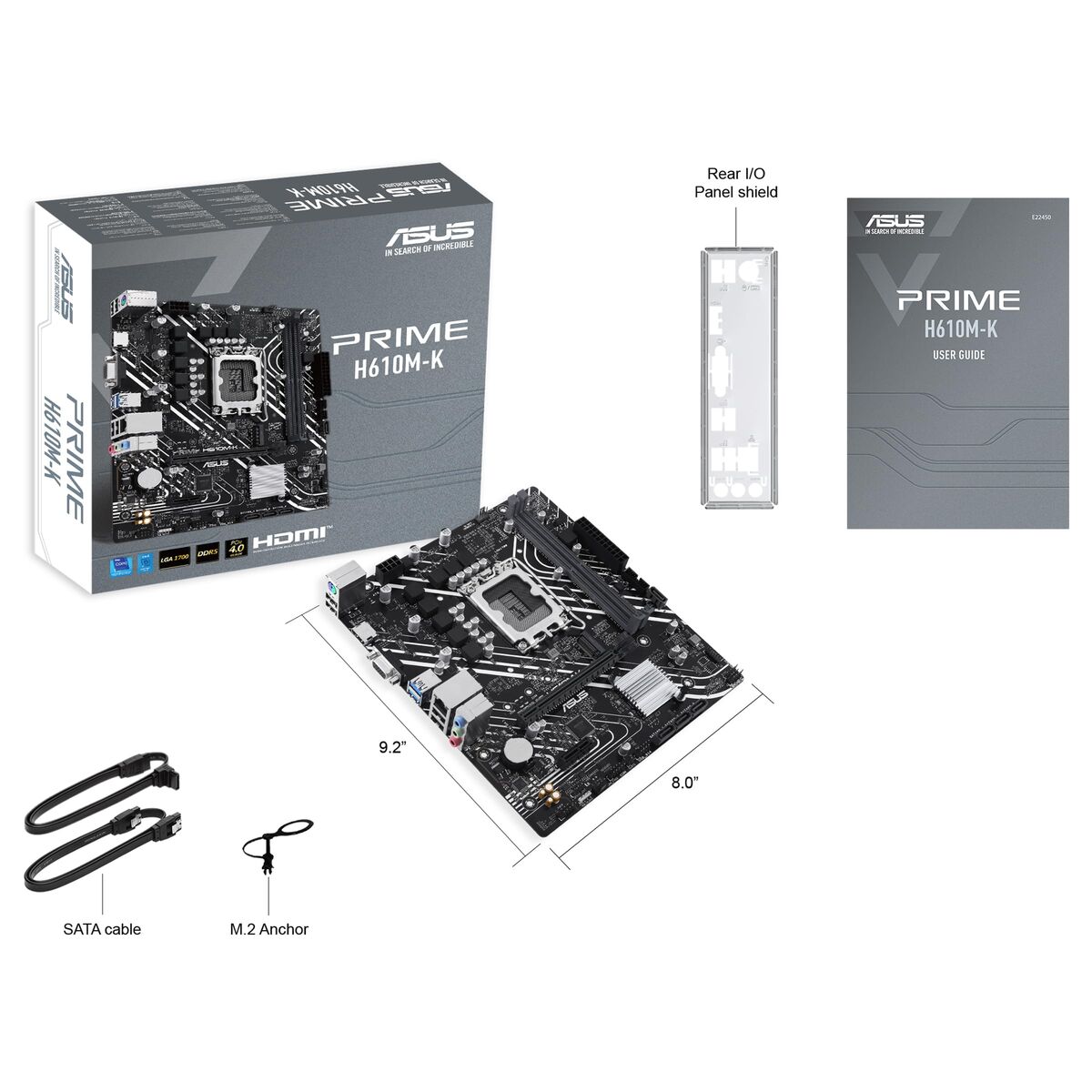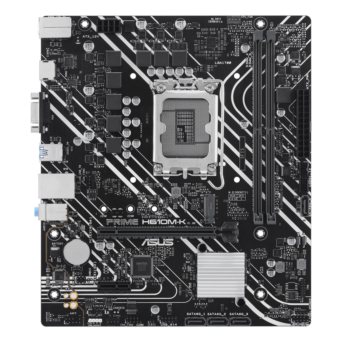 Si vous êtes passionné d'informatique et d'électronique, si vous êtes à la pointe de la technologie et qu'aucun détail ne vous échappe, achetez Carte Mère Asus PRIME H610M-K LGA 1700 au meilleur prix.La carte mère Asus PRIME H610M-K est un composant essentiel pour monter ou mettre à jour un PC de bureau recherchant un équilibre entre fonctionnalité, compatibilité et performance basique. Basée sur le chipset Intel H610, cette carte au format MicroATX (mATX) compact (23,4 x 20,3 cm) prend en charge les processeurs Intel Core de 12e et 13e génération, ainsi que les processeurs Pentium Gold et Celeron grâce à son socket LGA 1700. Ce support inclut des technologies modernes comme Intel Turbo Boost 2.0 et Turbo Boost Max 3.0, qui optimisent la fréquence du processeur pour améliorer les performances en cas de besoin de puissance accrue. Côté mémoire, elle dispose de deux emplacements DIMM compatibles DDR5 jusqu’à 5600 MHz, permettant d’installer jusqu’à 96 Go en double canal, avec prise en charge des profils XMP facilitant l’overclocking. Pour la partie graphique, elle offre des sorties VGA et HDMI, assurant une compatibilité avec les écrans anciens et les moniteurs HD modernes, idéale pour les configurations avec graphiques intégrés compatibles CPU. La carte intègre également un ensemble robuste de slots d’extension avec un PCIe 4.0 x16 pour cartes graphiques et un PCIe 3.0 x1 pour autres périphériques. En stockage, elle possède un slot M.2 compatible SSD PCIe 3.0 x4 (formats 2242, 2260, 2280) et quatre ports SATA à 6 Gb/s, offrant diverses options pour connecter des unités rapides ou classiques. Côté connectivité, le panneau arrière propose plusieurs ports USB, dont deux USB 3.2 Gen 1 (5 Gbps) type A et quatre USB 2.0, un port réseau Ethernet Realtek 1 Gb, un port PS/2 combiné clavier/souris, ainsi que des connecteurs audio avec codec Realtek 7.1 pour son surround, incluant une prise spécifique pour le panneau avant améliorant l’expérience multimédia. En interne, elle offre une large variété de connecteurs pour ventilateurs, alimentation 24 broches et 8 broches, headers RGB et autres connexions spécialisées pour contrôle et extension, la rendant adaptée aux montages personnalisés. La combinaison de ces caractéristiques, avec la qualité de fabrication propre à Asus, fait de la PRIME H610M-K une carte mère fiable et polyvalente pour systèmes polyvalents, particulièrement dans des environnements nécessitant une base solide avec des composants actuels sans fonctions haut de gamme avancées. Cette carte est une option équilibrée répondant aux besoins des utilisateurs recherchant compatibilité, mise à jour et connectivité dans un format compact et accessible.