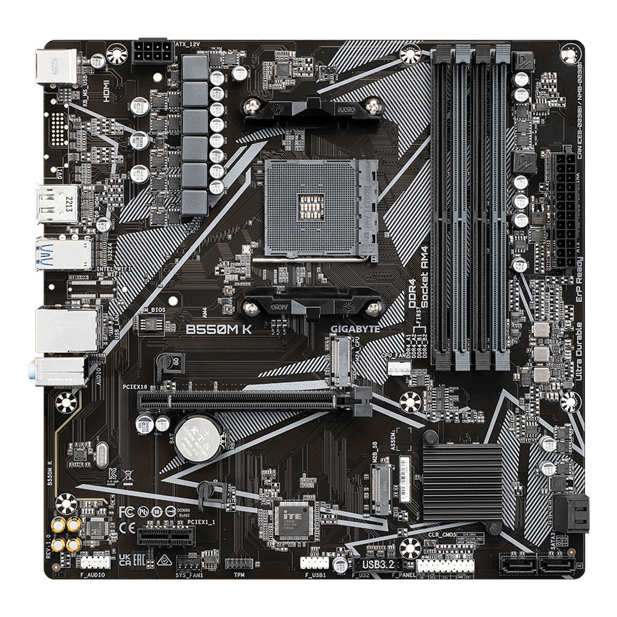 Si vous êtes passionné d'informatique et d'électronique, si vous êtes à la pointe de la technologie et qu'aucun détail ne vous échappe, achetez Carte Mère Gigabyte B550M K 1.0 AMD B550 AMD AMD AM4 au meilleur prix.La carte mère Gigabyte B550M K 1.0 est conçue pour les systèmes basés sur processeurs AMD Ryzen avec socket AM4, offrant une plateforme solide et évolutive pour PC de bureau compacts grâce à son format MicroATX (244 x 244 mm). Elle intègre le chipset AMD B550, qui permet de tirer parti des lignes PCI Express 4.0 avec CPU compatibles, améliorant les performances des cartes graphiques et des SSD NVMe de dernière génération. Elle prend en charge la mémoire DDR4-SDRAM sur slots DIMM avec une capacité maximale de 128 Go, adaptée aux tâches exigeantes comme la productivité avancée, le montage ou le multitâche intensif. Pour le stockage, elle propose 2 slots M.2 et 4 ports SATA, compatibles avec SSD et HDD, ainsi qu’un support RAID 0/1/10 pour optimiser vitesse ou redondance des données. Côté réseau, la carte offre un Gigabit Ethernet (Realtek 8111H) via un port RJ45, garantissant une connexion stable pour un usage domestique ou professionnel. La partie graphique repose sur un contrôleur graphique intégré dépendant du CPU et des sorties HDMI 2.1 et DisplayPort, capables de gérer des résolutions jusqu’à 5120 x 2880 pixels et compatibles DirectX 12.0, ce qui permet l’utilisation d’écrans haute résolution sans carte graphique dédiée dans des configurations de base. Le panneau arrière et les connecteurs internes incluent des ports USB 2.0 et jusqu’à 4 ports USB 3.2 Gen 1 pour périphériques et dispositifs externes, ainsi qu’un port PS/2 combiné pour clavier ou souris, connecteurs de microphone et audio. Le son est géré par le codec Realtek ALC897 avec audio haute définition 7.1 canaux, adapté aux systèmes multimédia et aux jeux. La carte utilise un BIOS UEFI pour une configuration claire du système, est optimisée pour Windows et est livrée avec les éléments essentiels tels que la visserie et une pile au lithium CR2032 pour la mémoire du BIOS. Dans l’ensemble, cette carte mère MicroATX B550 de Gigabyte offre une plateforme équilibrée et prête pour les configurations PC de bureau modernes.