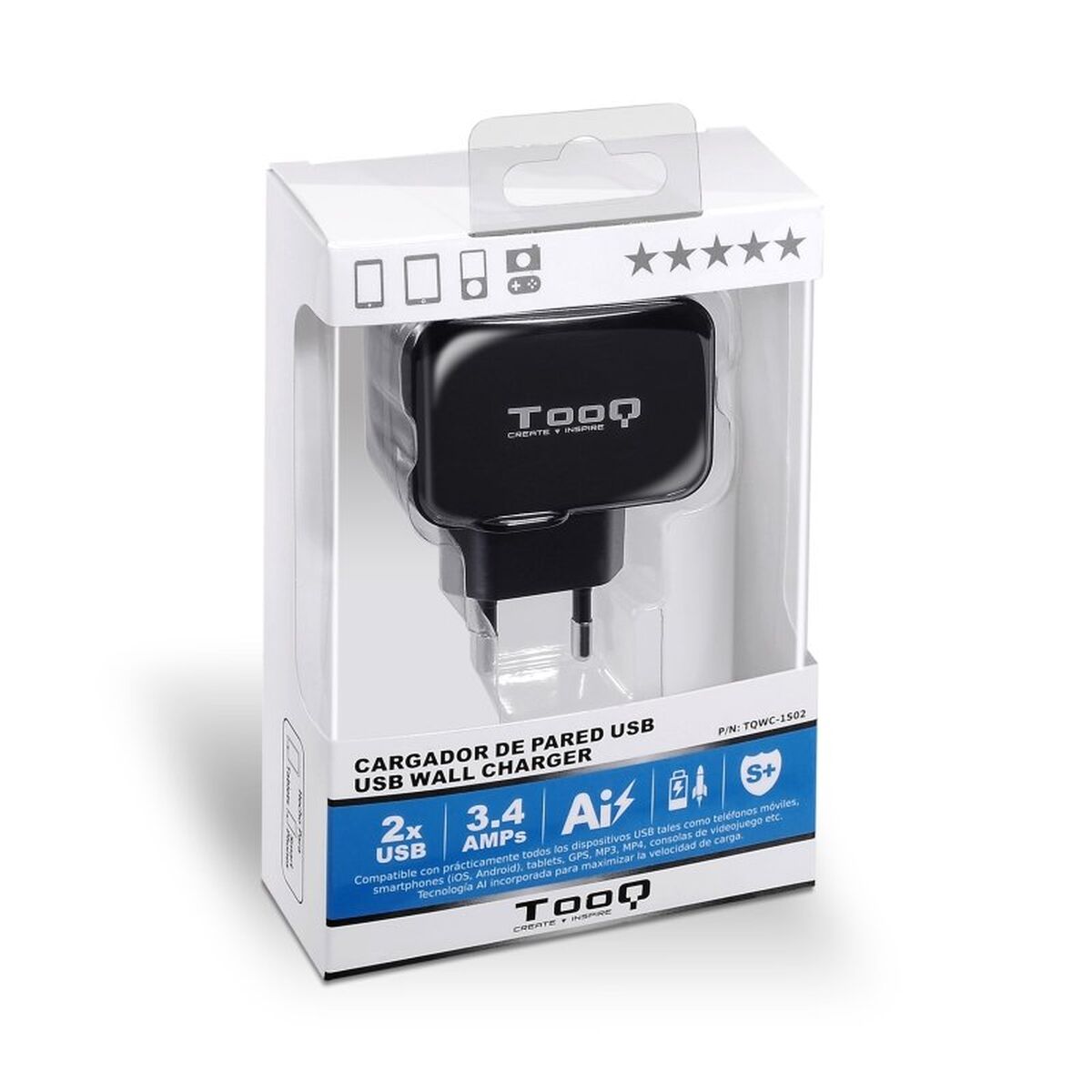 Si vous êtes passionné d'informatique et d'électronique, si vous êtes à la pointe de la technologie et qu'aucun détail ne vous échappe, achetez Chargeur mural TooQ TQWC-1S02 Noir 17 W au meilleur prix.Le TooQ TQWC-1S02 est un chargeur mural universel conçu pour offrir une solution pratique et efficace pour recharger vos appareils électroniques. Son format compact en noir facilite l’utilisation à la maison, au bureau ou en voyage, s’intégrant discrètement dans tout environnement. Ce modèle dispose de 2 ports USB 2.0, permettant de charger simultanément deux appareils tels que smartphones, tablettes, appareils photo ou périphériques compatibles, optimisant ainsi le temps de charge et la gestion de vos équipements essentiels au quotidien. Avec une tension de sortie de 5V et une puissance totale optimisée, il fournit une énergie stable et sûre, garantissant la protection des appareils connectés contre les surtensions et s’adaptant à différents fabricants et standards grâce à son caractère universel. Sa construction robuste et sa simplicité d’utilisation font de ce chargeur un accessoire indispensable pour ceux qui recherchent fiabilité et fonctionnalité dans un format compact et polyvalent. En résumé, le TooQ TQWC-1S02 s’impose comme une option polyvalente et abordable dans la catégorie des chargeurs USB multiprises, idéale pour garder plusieurs appareils connectés facilement et en toute sécurité.