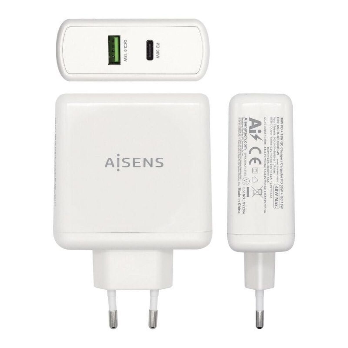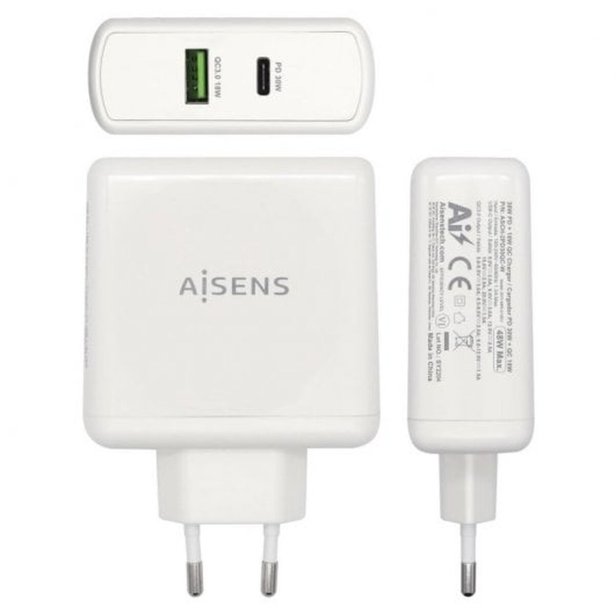Si vous êtes passionné d'informatique et d'électronique, si vous êtes à la pointe de la technologie et qu'aucun détail ne vous échappe, achetez Chargeur Voiture Mur Aisens ASCH-2PD30QC-W 48 W Blanc au meilleur prix.Le chargeur USB mural Aisens ASCH-2PD30QC-W offre une solution efficace et polyvalente pour recharger simultanément plusieurs appareils numériques, dont smartphones, tablettes, appareils photo et ordinateurs portables compacts. Son design en blanc s’intègre discrètement dans tout environnement, et son format compact permet un transport facile à la maison ou au bureau. Ce modèle dispose de ports USB-C et USB-A de dernière génération, assurant une large compatibilité avec les appareils modernes et anciens, y compris la connexion USB 2.0 et USB-C, permettant de charger deux appareils en même temps sans perte de vitesse. Le port USB-C avec technologie Power Delivery 3.0 délivre jusqu’à 30 W pour une charge rapide des appareils compatibles, tandis que le port USB-A avec Quick Charge 3.0 fournit jusqu’à 18 W pour une charge efficace d’autres appareils. Grâce à sa puce intelligente AI, le chargeur détecte automatiquement le protocole de l’appareil connecté, optimisant la puissance délivrée et la sécurité de chaque charge, avec des protections intégrées contre la surtension, la surcharge et les courts-circuits pour préserver vos équipements. Sa plage d’entrée universelle de 100-240V assure une compatibilité mondiale, idéale pour les voyageurs. Fabriqué selon des normes de qualité, ce chargeur est une solution pratique et polyvalente pour ceux qui recherchent rapidité, sécurité et adaptabilité lors de la recharge de leurs appareils électroniques.