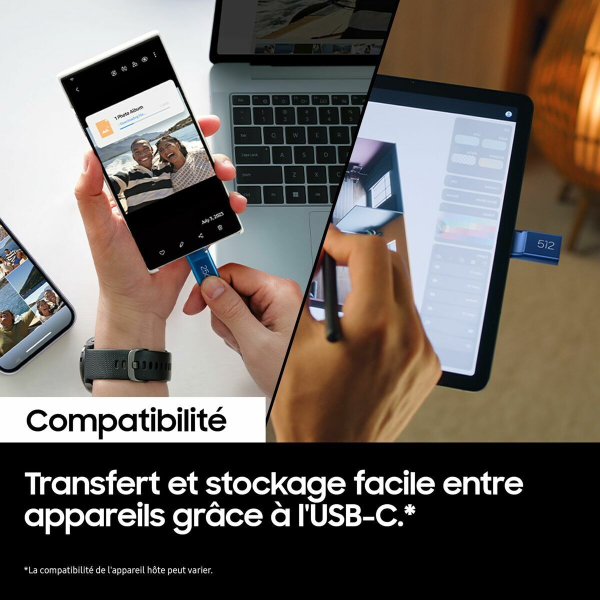 Si vous êtes passionné d'informatique et d'électronique, si vous êtes à la pointe de la technologie et qu'aucun détail ne vous échappe, achetez Clé USB Samsung MUF-512DA/APC Bleu 512 GB au meilleur prix.La clé USB Samsung en couleur bleue offre une grande capacité de stockage de 512 Go, idéale pour les utilisateurs ayant besoin de sauvegarder de nombreux fichiers, documents, photos ou vidéos en toute sécurité et rapidement. Elle est équipée d’une connectivité multiple incluant USB-A 3.0, USB-C et supporte la version USB 3.2, garantissant une compatibilité étendue avec divers appareils et une vitesse de transfert supérieure aux versions précédentes. Sa double interface permet une connexion pratique aussi bien sur ordinateurs classiques que sur appareils modernes, smartphones et tablettes avec port USB-C, facilitant l’échange efficace de données sans adaptateurs supplémentaires. De plus, cette clé se distingue par son design compact et robuste avec une finition bleue attrayante, facilitant son transport et une utilisation quotidienne. L’intégration des technologies USB 3.0 et USB 3.2 assure un transfert rapide et stable, réduisant les temps d’attente et améliorant la productivité en contexte professionnel ou personnel. Ce modèle Samsung allie capacité, polyvalence des connexions et design fonctionnel, se positionnant comme une option fiable et moderne dans la catégorie des mémoires externes à haute capacité et multiples options de connectivité.