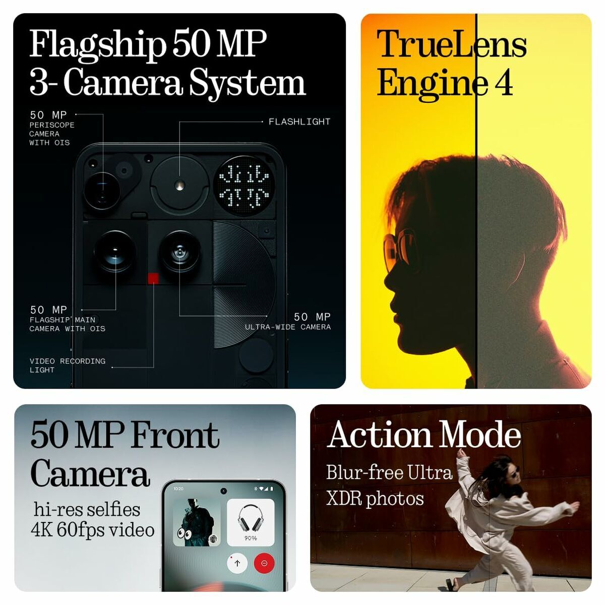 Si vous êtes à la recherche de nouvelles tendances sur le marché, nous vous présentons Smartphone Nothing PHONE 3 FLAGSHIP 6,67" 12 GB RAM 256 GB Noir !Le Nothing Phone 3 5G est un smartphone avancé qui allie design innovant et spécifications haut de gamme, destiné à ceux qui recherchent performance, style et connectivité de dernière génération. Doté d’un puissant processeur Snapdragon 8s Gen 4 à 3,2 GHz, il assure une expérience fluide en multitâche et lors d’activités intensives, soutenu par deux options de mémoire RAM de 12 Go ou 16 Go permettant une gestion optimale des applications exigeantes et des jeux. Il dispose d’un écran AMOLED de 6,67 pouces avec une résolution de 1260 x 2800 pixels, garantissant des images nettes, des couleurs éclatantes et une expérience visuelle immersive pour tout type de contenu, idéal pour les amateurs de multimédia. Le triple appareil photo arrière de 50 MP offre une grande polyvalence photographique, avec autofocus, pour capturer les détails dans diverses situations, tandis que la caméra frontale assure la qualité lors des appels vidéo et selfies. Sa grande capacité de stockage interne de 256 Go permet de gérer fichiers, photos, applications et vidéos sans souci d’espace. Il intègre la connectivité 5G, offrant des téléchargements ultra-rapides et des performances optimales sur les réseaux mobiles de dernière génération. Le système d’exploitation est Android 15, garantissant un environnement sécurisé et à jour avec accès aux dernières fonctionnalités. La batterie de 5150 mAh offre une autonomie suffisante pour accompagner une utilisation intensive au quotidien, tandis que le USB-C assure une charge efficace et un transfert de données rapide. Parmi ses autres atouts figurent le GPS intégré, un capteur de lumière ambiante et la compatibilité Dual SIM, offrant une flexibilité d’utilisation personnelle ou professionnelle. Le design en noir lui confère une allure élégante et moderne, avec un poids équilibré de 218 g pour une prise en main confortable. Le Nothing Phone 3 5G s’impose comme une option haut de gamme pour ceux qui recherchent puissance, connectivité et design distinctif.