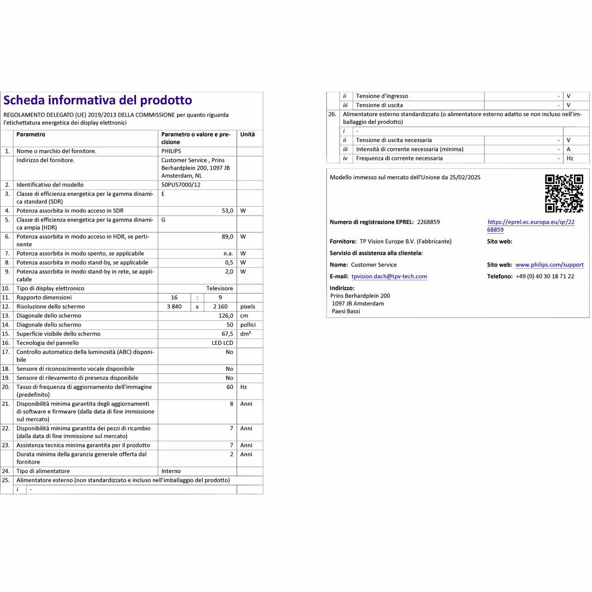 Si vous êtes à la recherche de nouvelles tendances sur le marché, nous vous présentons TV intelligente Philips 50PUS7000 50" 4K Ultra HD LED HDR !Le modèle 50PUS7000 de Philips est un Smart TV de 50 pouces qui allie qualité d’image avancée et fonctionnalités intelligentes, idéal pour les utilisateurs recherchant une expérience visuelle de haut niveau et une connectivité polyvalente à domicile. Son écran plat de 50" avec une résolution 4K Ultra HD (3840 x 2160 pixels) offre une reproduction nette et détaillée, parfaite pour profiter de contenus en haute définition avec des couleurs vives et une grande précision. Ce téléviseur est équipé d’un système d’exploitation Titan OS, qui facilite l’accès aux applications et services en ligne via sa connexion WiFi intégrée, offrant un accès simple aux plateformes de streaming et contenus multimédias. Côté son, il dispose d’une puissance estimée à 20W RMS, suffisante pour un audio clair et immersif dans un usage courant. De plus, il intègre un système robuste de syntonisation numérique compatible avec plusieurs formats, dont DVB-C, DVB-S, DVB-S2, DVB-T, DVB-T2 et DVB-T2 HD, garantissant une réception sans faille des signaux terrestres et satellites ainsi qu’une large couverture des chaînes numériques. Sa finition en noir apporte un design sobre et élégant qui s’intègre parfaitement à tout intérieur. La classe énergétique E indique une consommation maîtrisée dans sa catégorie, équilibrant performance et efficacité. Ce téléviseur Philips 50PUS7000 est une solution adaptée pour ceux qui recherchent un Smart TV avec une résolution avancée, des fonctionnalités modernes et une connectivité complète pour le divertissement numérique.