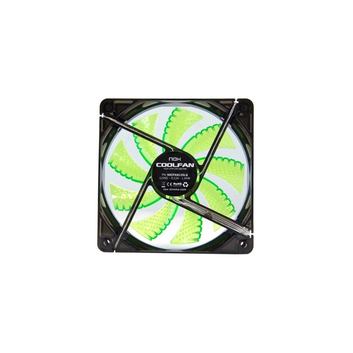 NOX Coolfan 120 LED. Type: Ventilateur, Diamètre du ventilateur: 12 cm, Vitesse de rotation (max): 1200 tr/min, Niveau de son (vitesse rapide): 19 dB, Courant d'air maximum: 40,5 cfm, Pression d'air maximale: 1,53 mmH2O. Tension: 19 V. Largeur: 120 mm, Profondeur: 120 mm, Hauteur: 25 mm. Couleur du produit: Noir, Vert